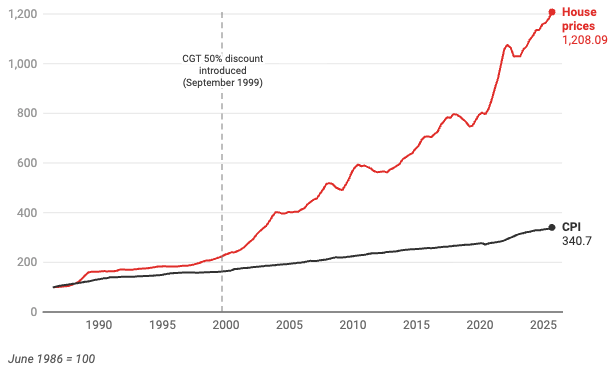 Each year, Treasury calculates the costs of tax policies. This data reveals that in 2024–25 the 50% discount cost the budget an estimated $19.7 billion. This is partly driven by increases in housing prices which have far outpaced inflation, as shown below.